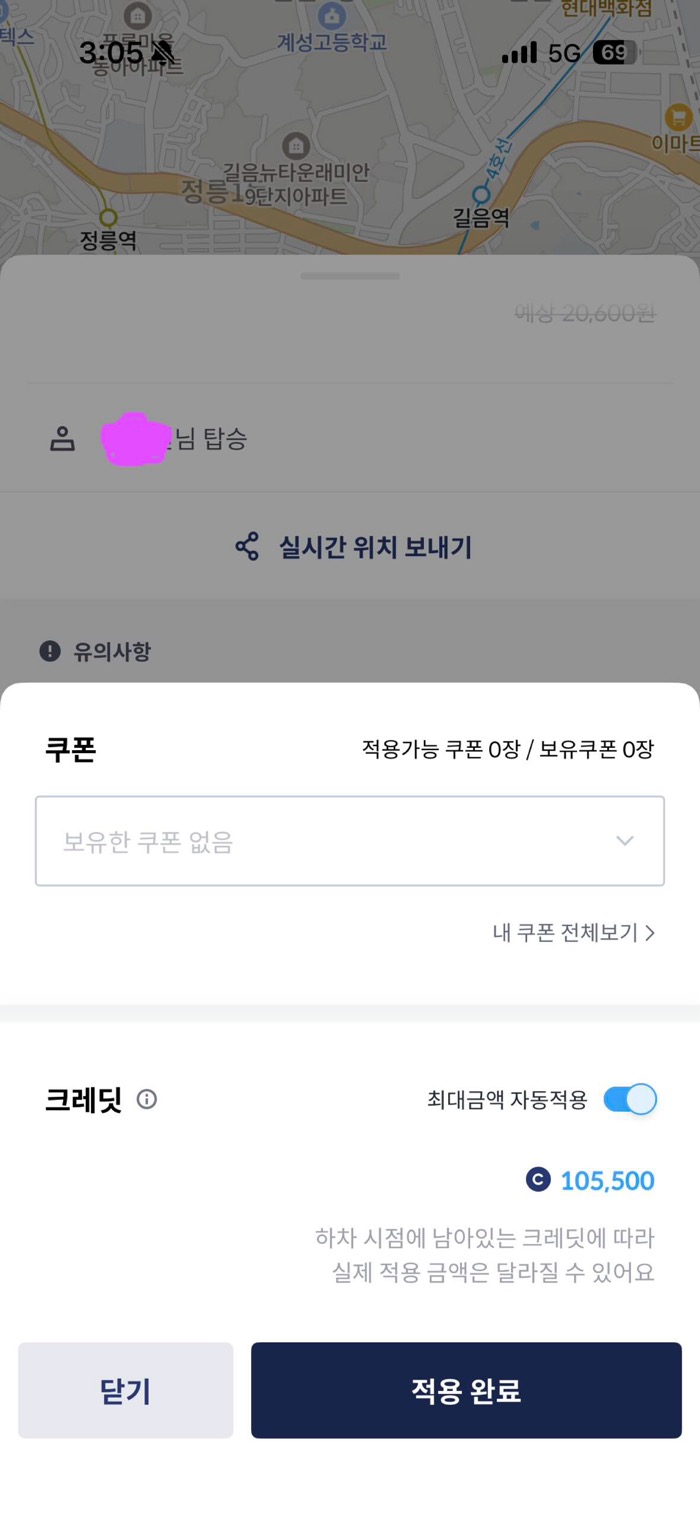 집에서 병원으로 이동할 때는 콜을 부르니 20분 이상 거리에서 오는 게 잡혀서 두 번이나 취소해서 겨우 이동했고, 집으로 돌아올 땐 10분 이내 거리 차량이 다행히 잡혀 비교적 쉽게 차량을 잡을 수 있었다!