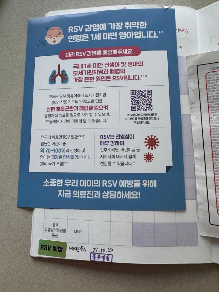나는 접종하러 갈 때 애기 건강수첩을 가져갔는데 따로 RSV칸은 없지만 이렇게 아래에 붙여주기 때문에 병원에 갈 때 건강수첩을 가져가는 걸 추천한다!