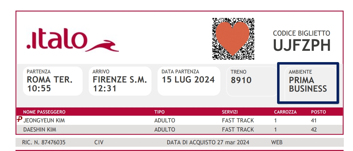 이전 포스팅에서도 언급한 것처럼 이탈리아 기차 회사는 트렌이탈리아와 이탈로가 있는데, 주로 이탈로가 대도시간 이동 시에는 더 저렴한 듯 했다. 우리가 예약할 당시에는 트렌이탈리아보다 이탈로를 PRIMA BUSINESS(프리미엄) 좌석으로 앉으면서도 저렴하게 예약할 수 있었기 때문에 주저없이 이탈로 예약.