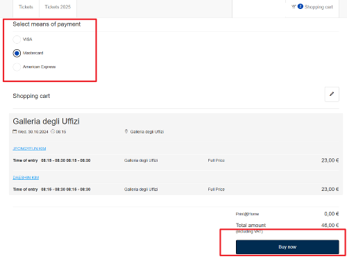 우피치 미술관은 피티궁, 보블리 정원과 함께 티켓을 구매할 수 있는데 왼쪽부터 세 개는 싱글티켓(각각의 장소만 예매)이고, 맨 오른쪽은 5일 통합권으로 모두 갈 수 있다. 참고로 피티궁과 보블리 정원만 같이 관람하는 것도 팔고 있다. 우피치 미술관 티켓은 맨 왼쪽이라 맨 왼쪽 'Buy online' 버튼을 누른다.