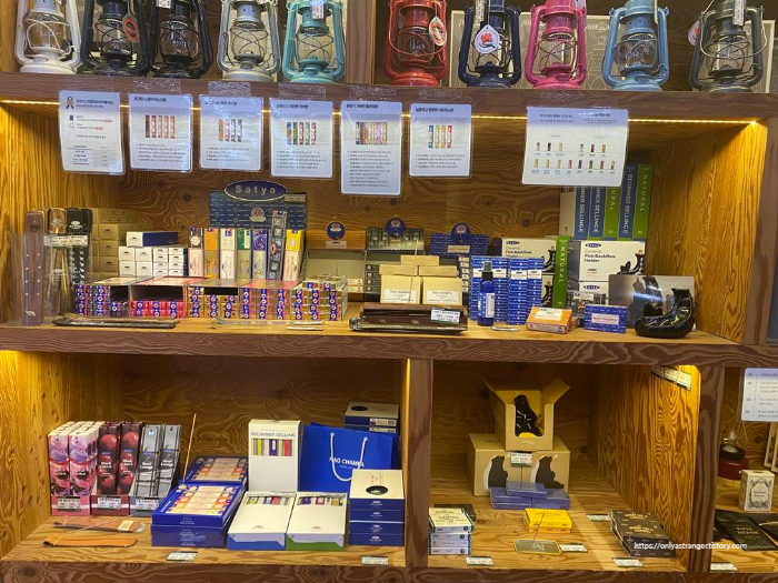 지하로 내려가는 길 왼쪽에 이렇게 인센스 스틱 및 감성 랜턴? 류가 진열되어 있다. 인센스 스틱은 우리는 연기가 아무래도 나기 때문에 밖에서 있을 때나 사용하는데 은근 텐트 내부에서도 쓰는 사람이 많은 거 같아 신기하다. 눈이 맵지 않나?