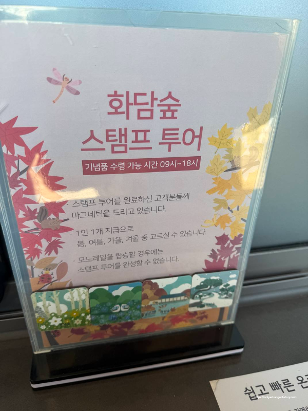 화담숲은 일반 관람로를 따라 천천히 걷다보면 총 5곳의 스탬프를 찍는 곳이 있는데 매표소에 있는 관람안내문을 들고 다니며 스탬프를 모두 모으면 굿즈(마그넷)를 1명당 한 개씩 받을 수 있다.