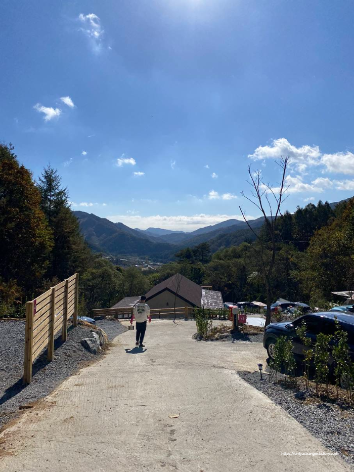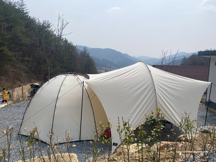이때는 M타프에 허브쉘터 조합으로 했는데 M타프가 사실 사이즈가 정~말 큰 편인데도 타프와 쉘터 모두 피칭이 가능한 넓은 사이트여서 매우 만족했다. [사실 이때 우리는 위 사이트가 비어서 사장님께서 위 사이트에 주차하도록 해주셔서 피칭이 가능했다. 대체로 사이즈들은 엄청 넓은 편이나 사이트별로 사이즈가 약간씩 다르니 예약할 때 사이트 사이즈를 꼭 확인하면 좋을 듯하다]