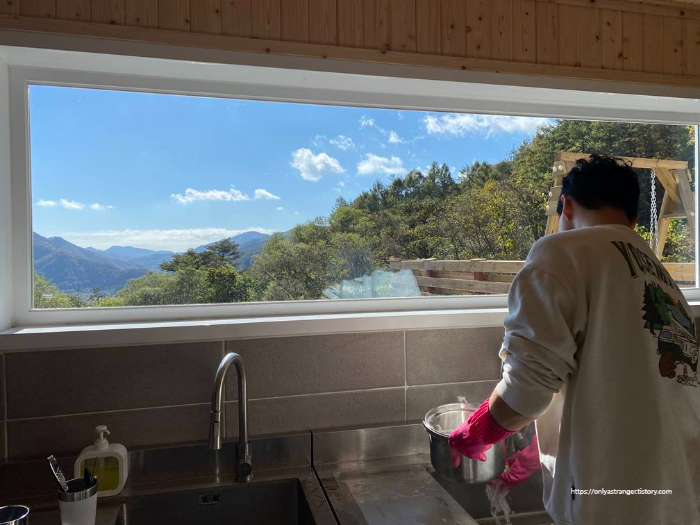 아래 사진처럼 개수대에서는 이렇게 밖을 내다볼 수 있는 창도 있다. 아래 사진 오른쪽을 보면 그네도 설치되어 있는데 그네가 중간중간 3개 정도? 있어서 아이들이 타고 놀기 좋다.