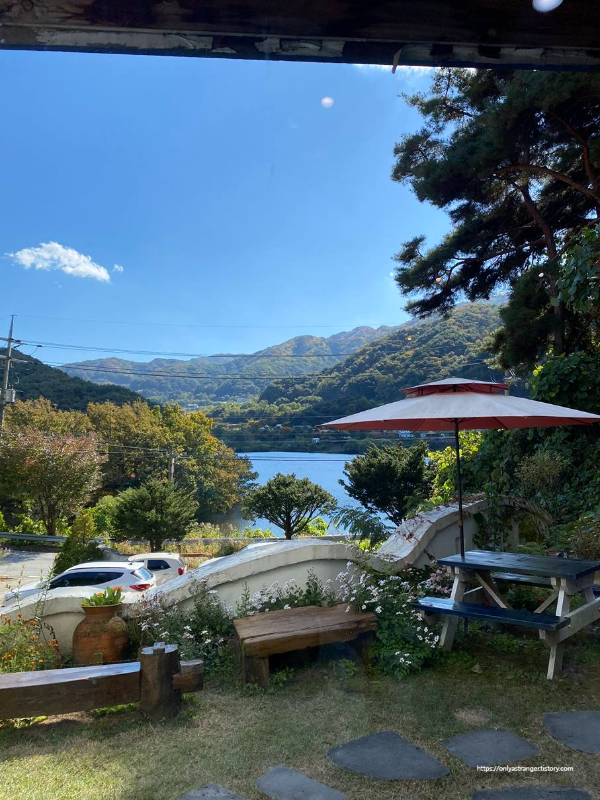 사실 우리가 월강캠프를 가면 꼭 들리는 카페가 있는데 이 카페 꼼방이다. 꼼방은 사장님께서 키우시는 개들 이름이었는데 한 마리는 안타깝게 죽었다고 한다. 지금도 큰 개가 한 마리 있는데 엄청 순하고 살이 통통해서 그런지 귀찮아해서 간식이 없으면 안 온다. [개라고 무서워한다면 걱정할 필요가 없다. 자기 지정석에 누워서 간식이 없으면 안 오니까.]