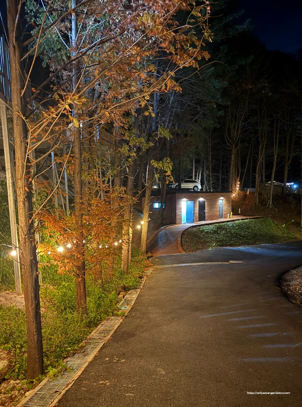 확실히 가을에서 겨울이 되어 가는 시점이라 그런지 해가 빨리 지는 느낌이었는데, 조명과 벽돌로 조성된 편의시설이 잘 어울렸다. 전반적으로 사이트들을 모두 데크로 해서 그런지 높은 나무와 데크의 분위기로 깔끔하게 사진을 찍기에 좋은 캠핑장 같았다.