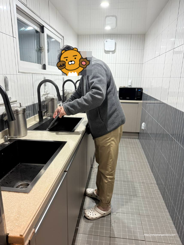 개수대도 이렇게 깔끔한 스타일이고 전자레인지가 하나 구비되어 있다. 그래도 가건물이 아니라 개수대에서 있을 땐 아직까지는 춥지 않았다.