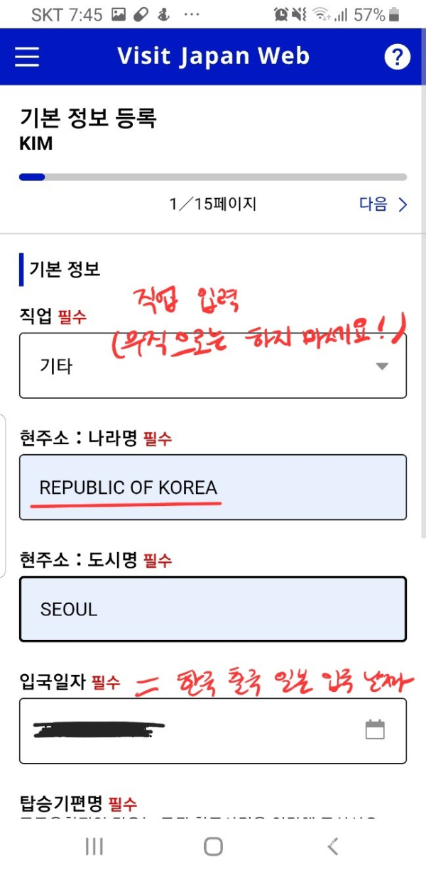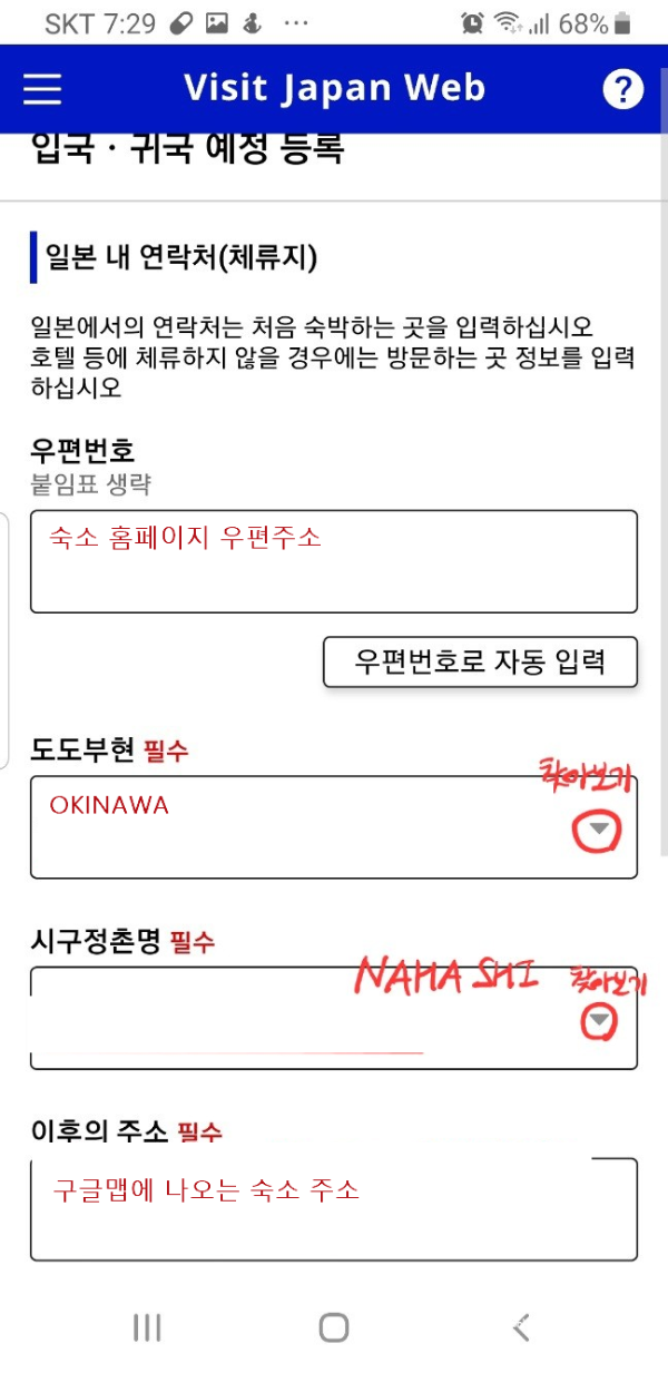 그 이후에 나오는 일본 내 연락가능 연락처는 한국 핸드폰 번호를 그냥 입력하시면 됩니다.